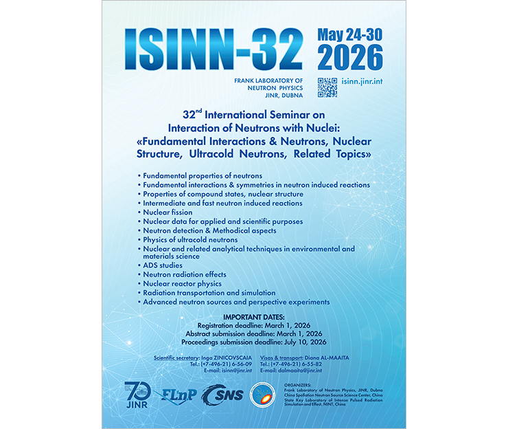 С 24 по 30 мая 2026 года в Лаборатории нейтронной физики ОИЯИ пройдет 32-й Международный семинар по взаимодействию нейтронов с ядрами «Фундаментальные взаимодействия и нейтроны, структура ядра, ультрахолодные нейтроны и смежные темы» (ISINN-32). Его участники обсудят различные аспекты фундаментальных и прикладных исследований в области нейтронной физики и технику экспериментов с нейтронами.