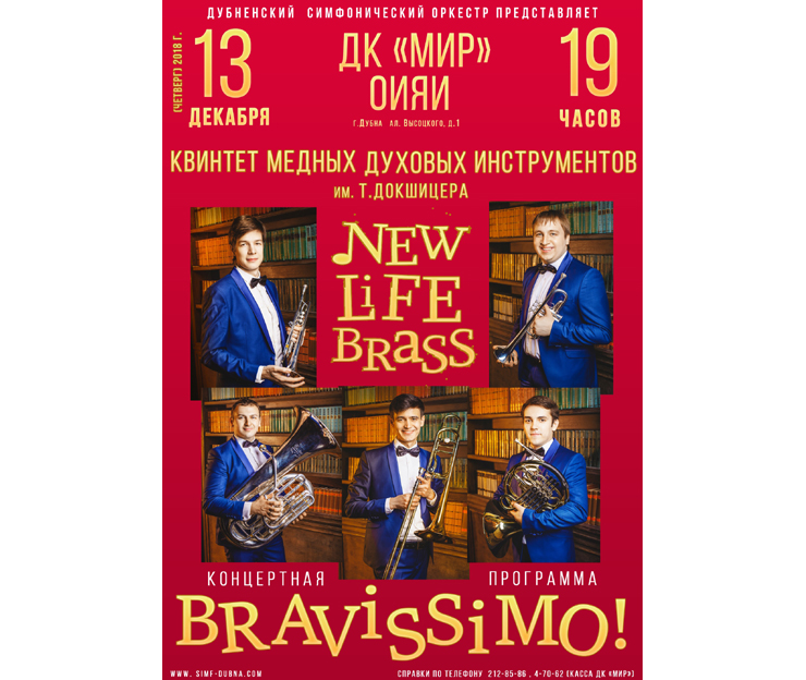 The JINR Cultural Centre “Mir” invites to the concert of the “NEW LIFE BRASS” T.Dokshchitser Quintet of brass wind instruments. The concert will be held on 13 December 2018 at 7:00 PM. The quintet will present the concert programme “BRAVISSIMO”.