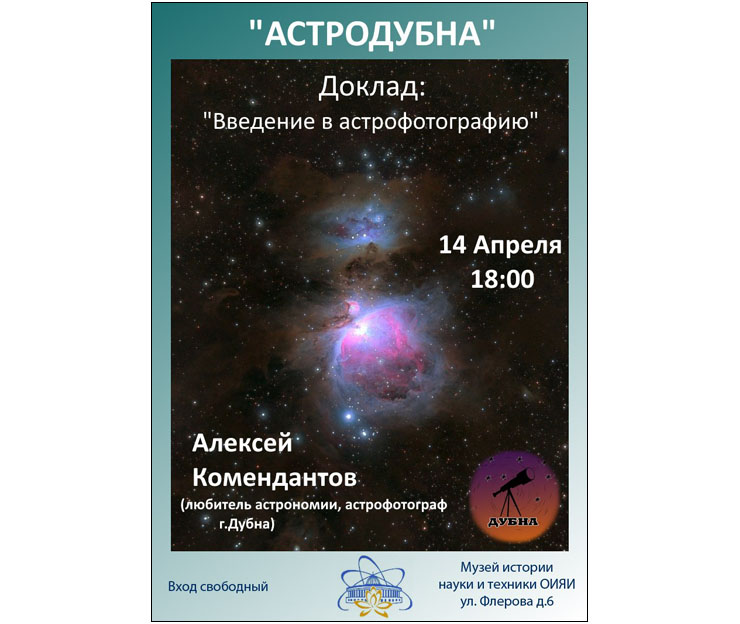 On 14 April 2018 at 6:00 PM, in the Museum of History of Science and Technology of JINR, the second meeting of the Astroclub will be held. The report “Introduction to astrophotography” will be delivered.