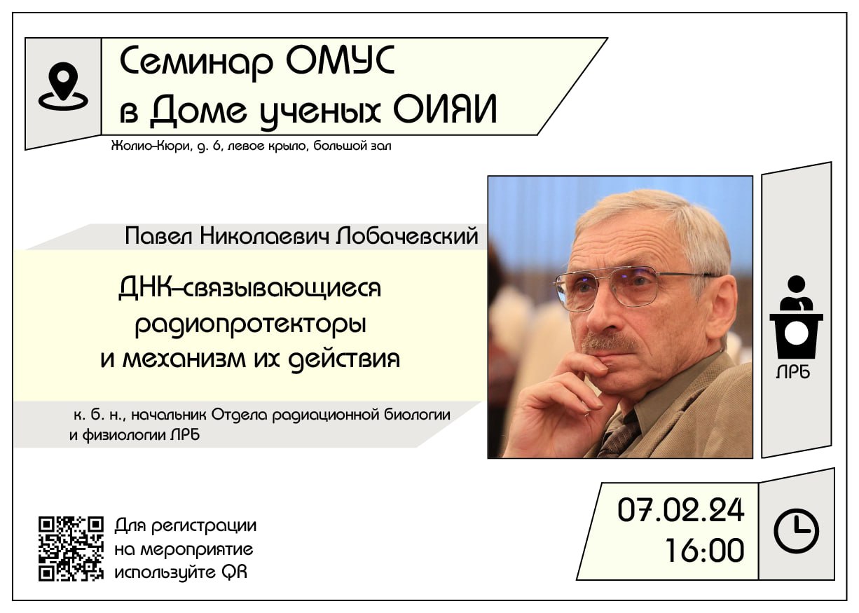 Кандидат биологических наук, начальник Отдела радиационной биологии и физиологии ЛРБ ОИЯИ Павел Лобачевский выступит с лекцией «ДНК-связывающиеся радиопротекторы и механизм их действия».