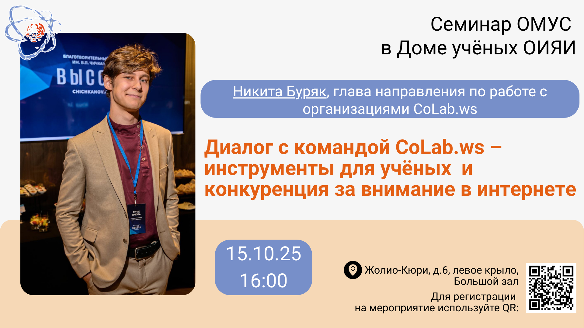 15 октября 2025 г. в 16:00 Объединение молодых ученых и специалистов ОИЯИ приглашает на очередной семинар в большом зале Дома ученых ОИЯИ (ул. Жолио-Кюри, 6, левое крыло).