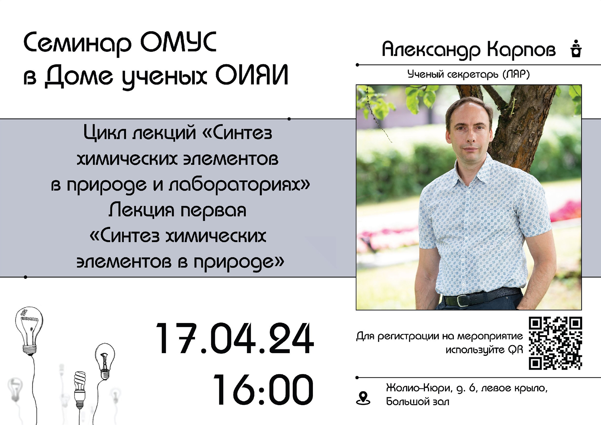 17 апреля 2024 г. в 16:00 Объединение молодых ученых и специалистов ОИЯИ приглашает на очередной семинар в большом зале Дома ученых ОИЯИ (ул. Жолио-Кюри, 6, левое крыло).
