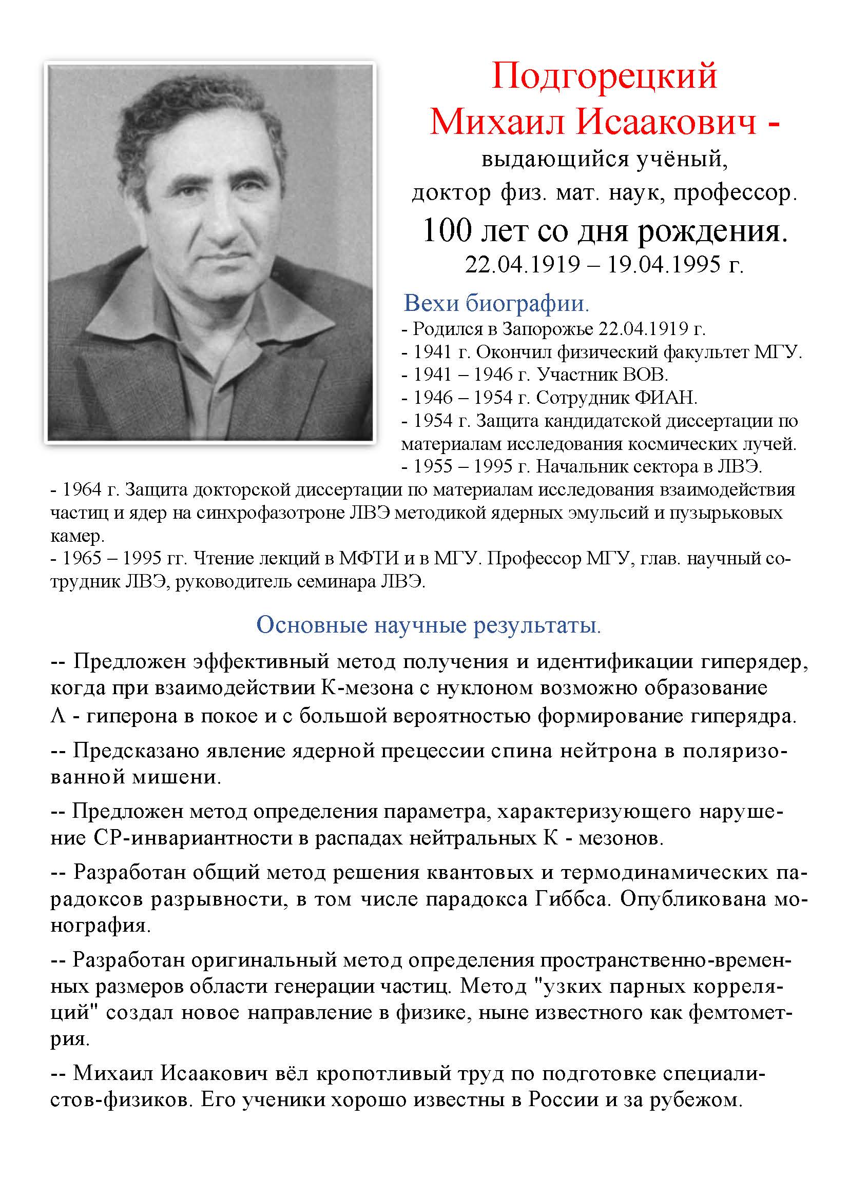 Семинар посвященный 100-летию выдающегося ученого, д.ф.м.н., профессора Михаила Исааковича Подгорецкого (22.04.1919 — 19.04.1995)