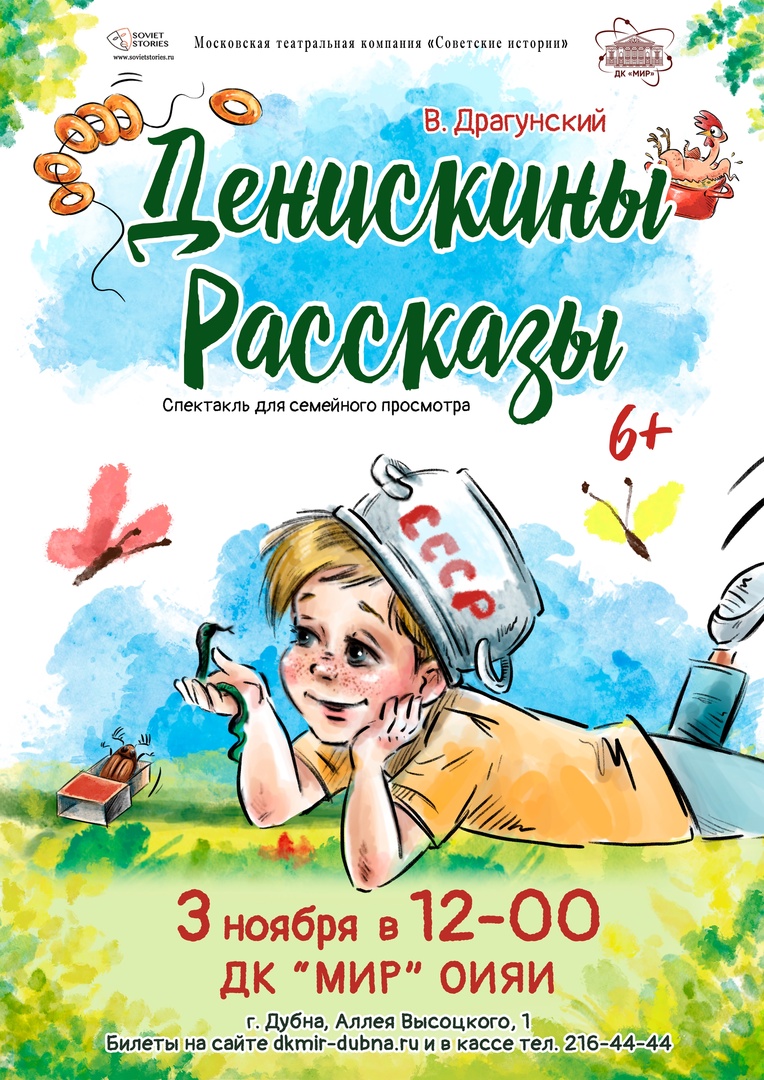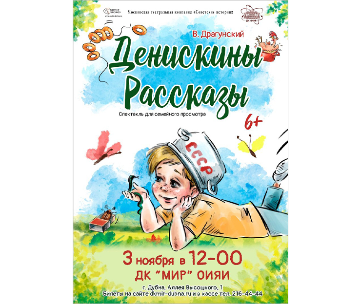 3 ноября 2024 г. в 12:00 Московская театральная компания «Советские истории» представит в ДК «Мир» ОИЯИ спектакль «Денискины рассказы» по сборнику рассказов Виктора Драгунского.