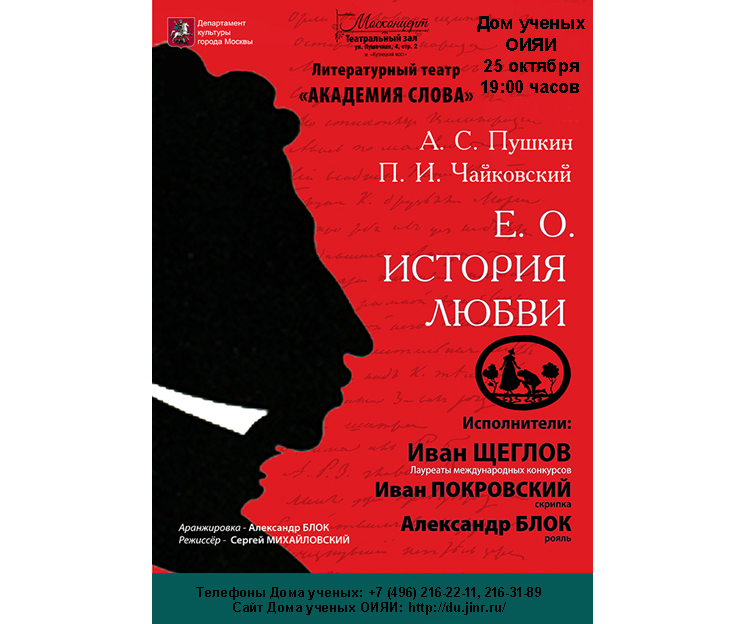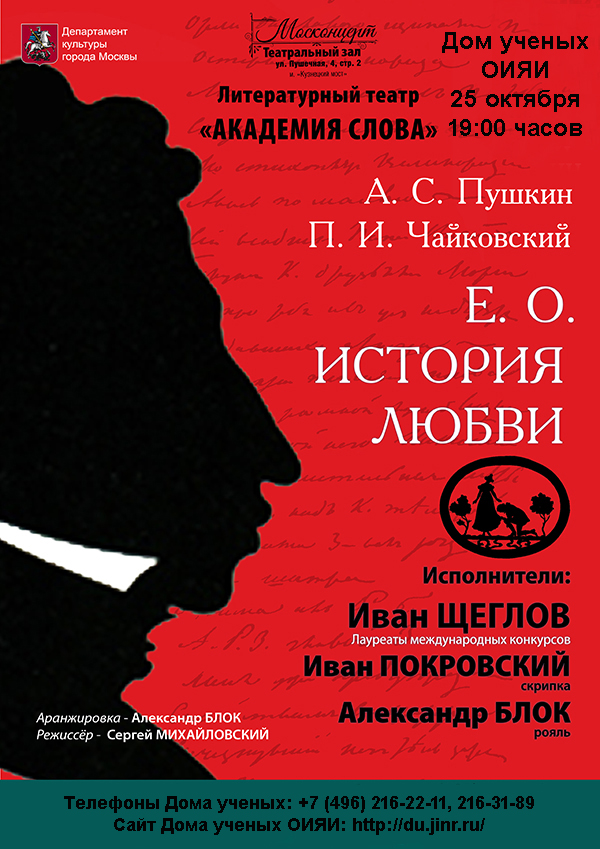 В четверг, 25 октября 2018 г. в 19:00 часов Дом ученых ОИЯИ приглашает на спектакль «Е.О. История Любви» (А.С. Пушкин, П.И. Чайковский) в исполнении Литературного театра «Академия слова».
