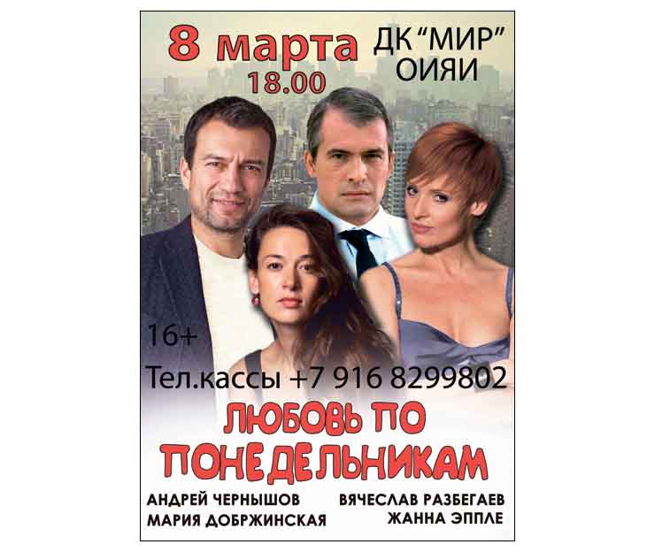8 марта 2019 года, в 18:00 часов Дом культуры «Мир» ОИЯИ приглашает на Спектакль «Любовь по понедельникам».