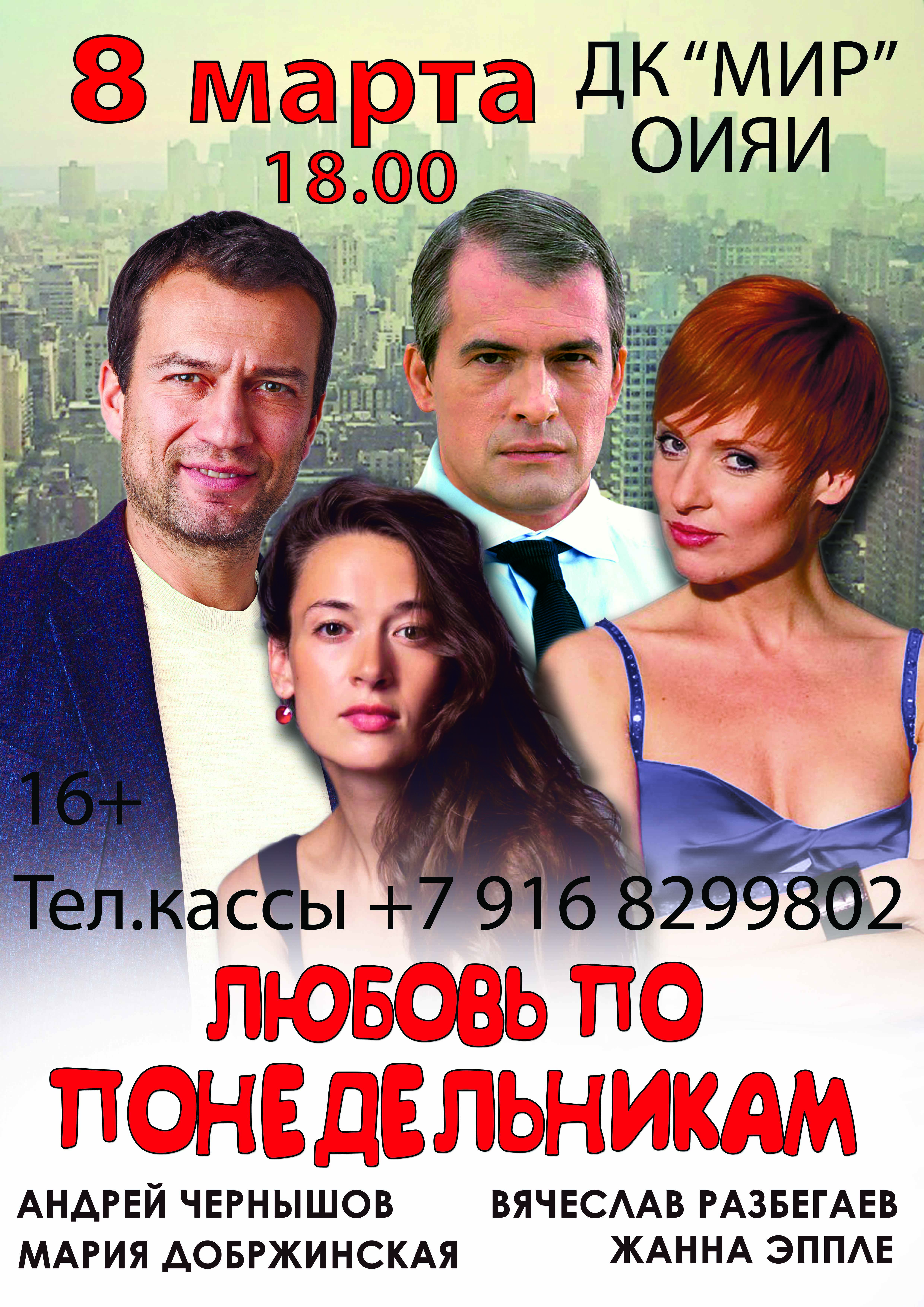 8 марта 2019 года, в 18:00 часов Дом культуры «Мир» ОИЯИ приглашает на Спектакль «Любовь по понедельникам».