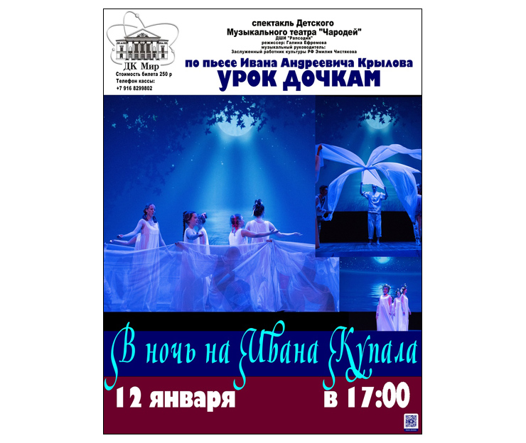 12 января 2019 года, в 17:00 часов Дом культуры «Мир» ОИЯИ приглашает на спектакль «В ночь на Ивана Купала» по пьесе И.А. Крылова «Урок дочкам». Постановка — Детский музыкальный театр «Чародеи». Режиссер — Галина Ефремова. ДШИ «Рапсодия».
