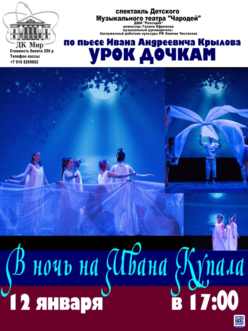 12 января 2019 года, в 17:00 часов Дом культуры «Мир» ОИЯИ приглашает на спектакль «В ночь на Ивана Купала» по пьесе И.А. Крылова «Урок дочкам». Постановка — Детский музыкальный театр «Чародеи». Режиссер — Галина Ефремова. ДШИ «Рапсодия».