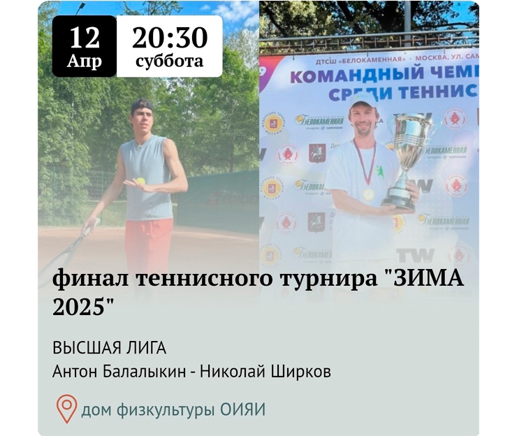 On 12 April 2025, the final match of the Winter 2025 tennis tournament will take place at the JINR Sports Club.