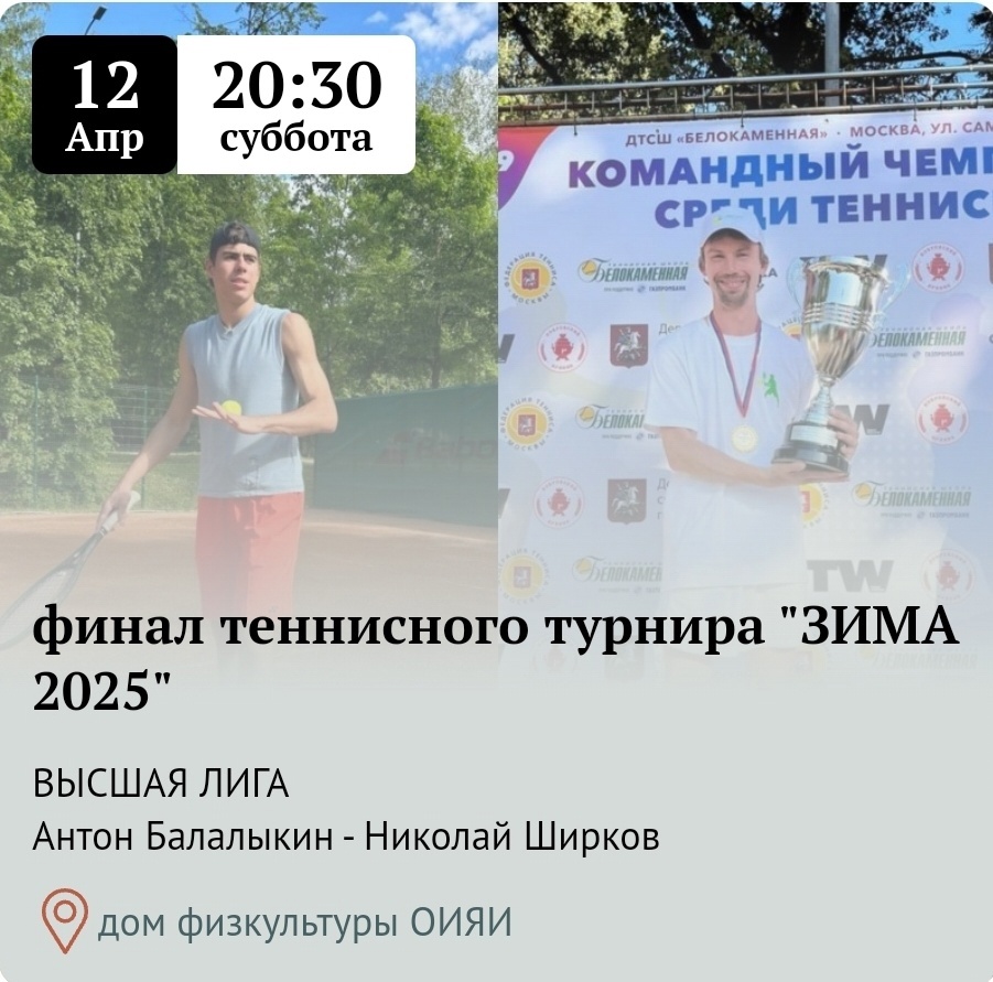 On 12 April 2025, the final match of the Winter 2025 tennis tournament will take place at the JINR Sports Club.