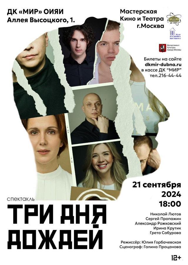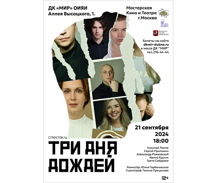 On 21 September 2024, at 6:00 PM, the Cinema and Theatre Workshop (Moscow) will present the Three Days of Rain drama performance based on a play by Richard Greenberg at the JINR Mir Cultural Centre.