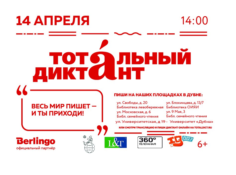 14 апреля 2018 года Универсальная библиотека ОИЯИ станет одной из городских площадок Тотального диктанта-2018!