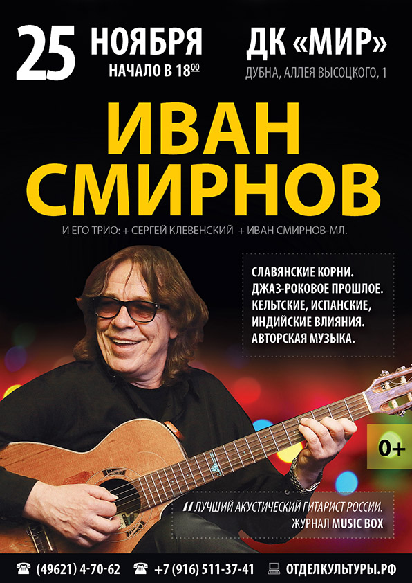 25 ноября 2017 г. в 18.00 часов Дом культуры «Мир» ОИЯИ представляет — Трио Ивана Смирнова (Москва) — World music, один из лучших акустических гитаристов России.