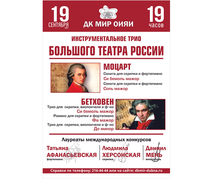 19 сентября в 19:00 в Доме культуры «Мир» ОИЯИ состоится концерт инструментального трио Государственного академического Большого театра России.