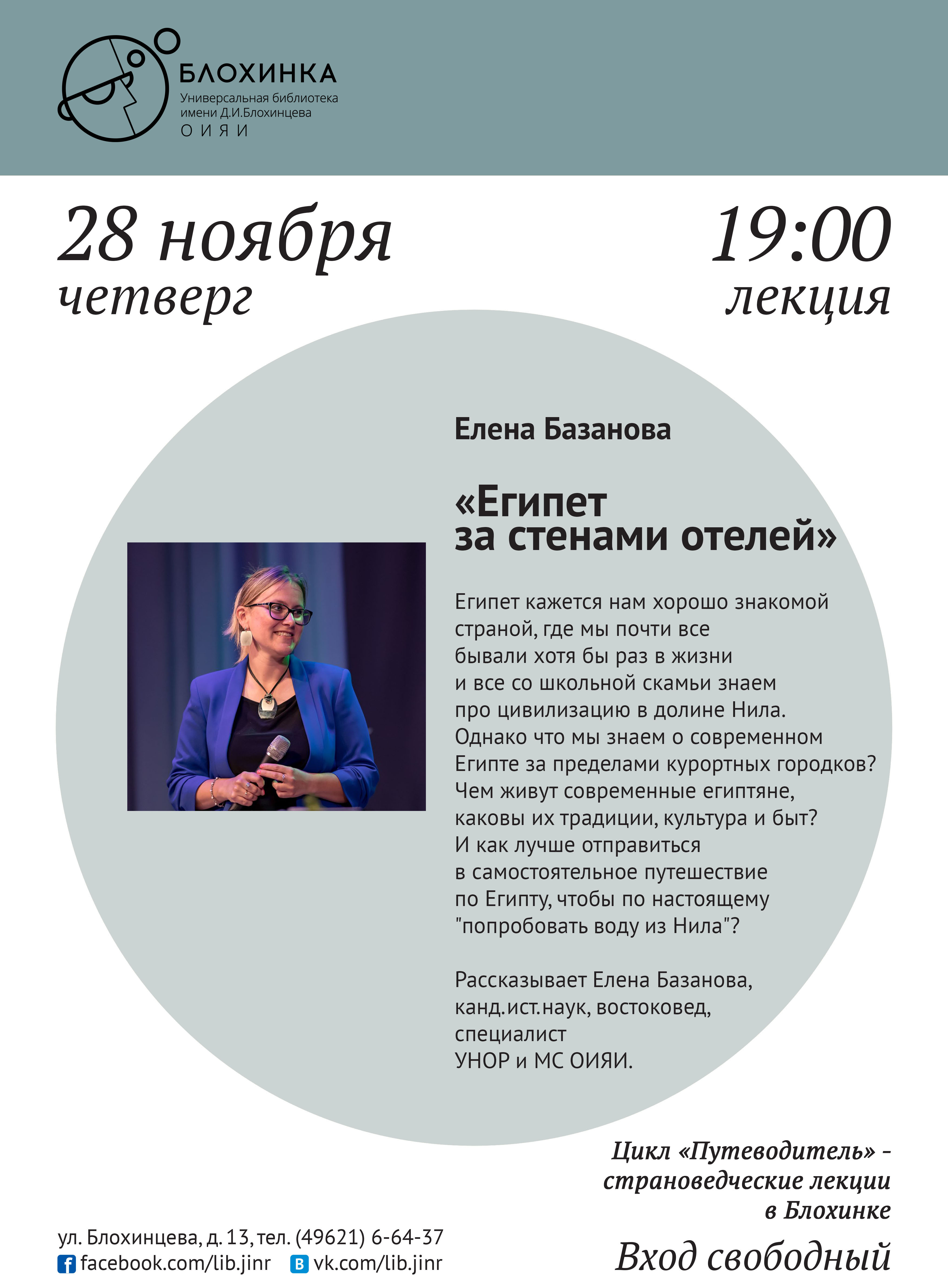 (ул. Блохинцева 13/7) приглашает на цикл лекций «Путеводитель: страноведческие лекции в Блохинке». 28 ноября в 19:00 Елена Базанова, канд.ист.наук, востоковед, специалист УНОР и МС ОИЯИ прочтет лекцию «Египет за стенами отелей».