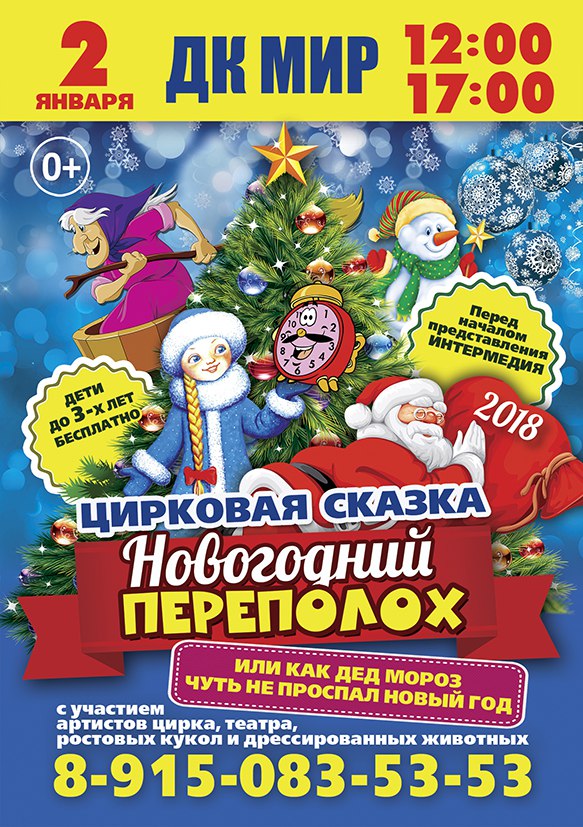 Приглашаем Вас и ваших детишек 2 января в 12.00 и в 17.00 в ДК «МИР» ОИЯИ на цирковой спектакль для всей семьи – «Новогодний Переполох»!