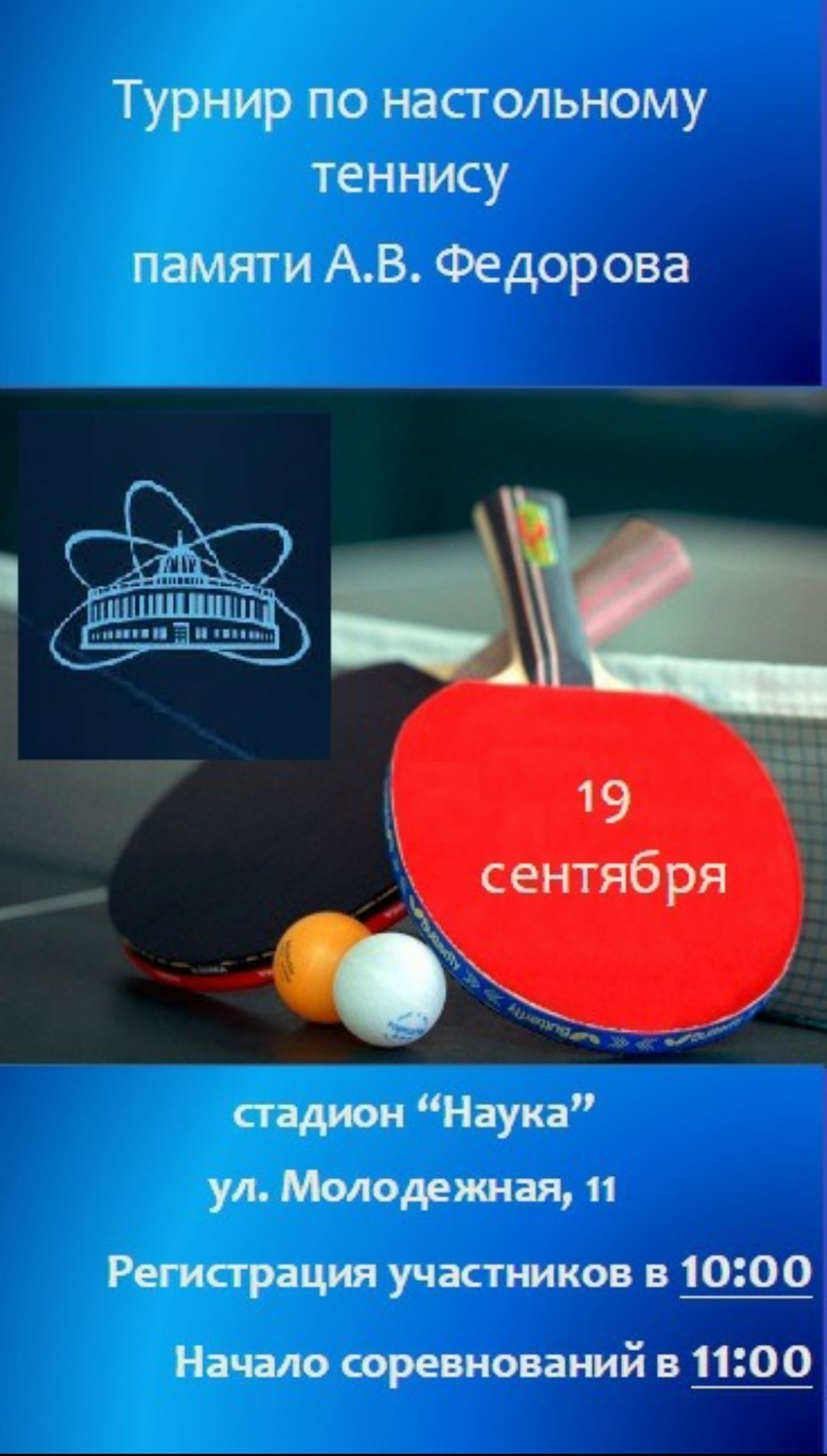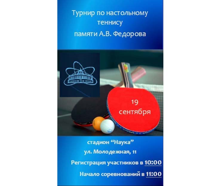 19 сентября 2020 года на стадионе «Наука» (ул. Молодежная д.11) пройдет Турнир по настольному теннису памяти А.В. Федорова. Регистрация участников откроется в 10:00 часов. Начало первенства в 11:00 часов.