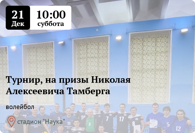 21 декабря 2024 года на площадке спорткомплекса ОИЯИ пройдет турнир по волейболу на призы Николая Алексеевича Тамберга. Начало турнира в 10:00 часов.