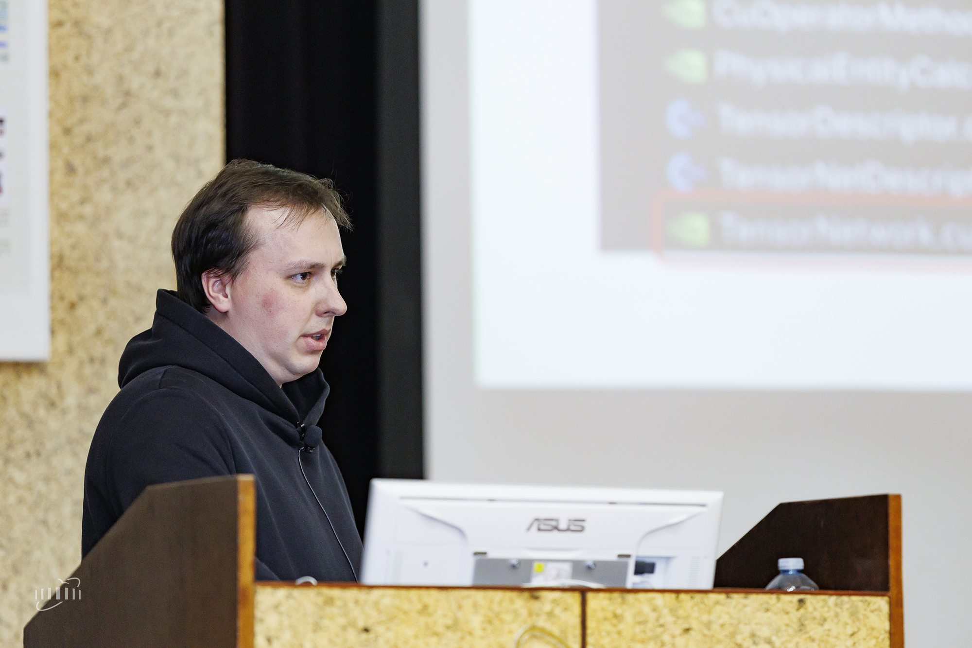 Научный сотрудник ЛИТ Евгений Толочко представил сообщение о научных исследованиях: «QTensorNet: инструмент для моделирования квантовых систем, использующий тензорные сети». «В нашей группе под влиянием опыта Геннадия Алексеевича выросло совершенно новое направление, связанное с тензорными сетями», — отметил он.