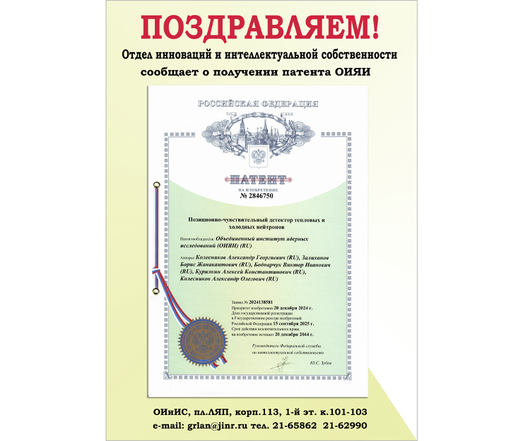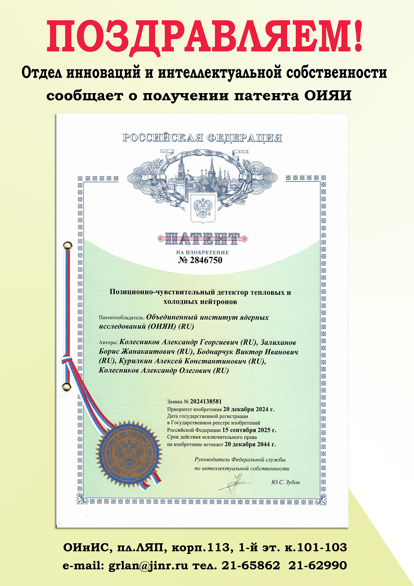 Патент RU 2846750 на позиционно-чувствительный детектор тепловых и холодных нейтронов был зарегистрирован 15 сентября 2025 года. Авторы изобретения: Александр Георгиевич Колесников (ЛНФ), Борис Жанакаитович Залиханов (ЛЯП), Виктор Иванович Боднарчук (ЛНФ), Алексей Константинович Курилкин (ЛНФ), Александр Олегович Колесников (ЛФВЭ).