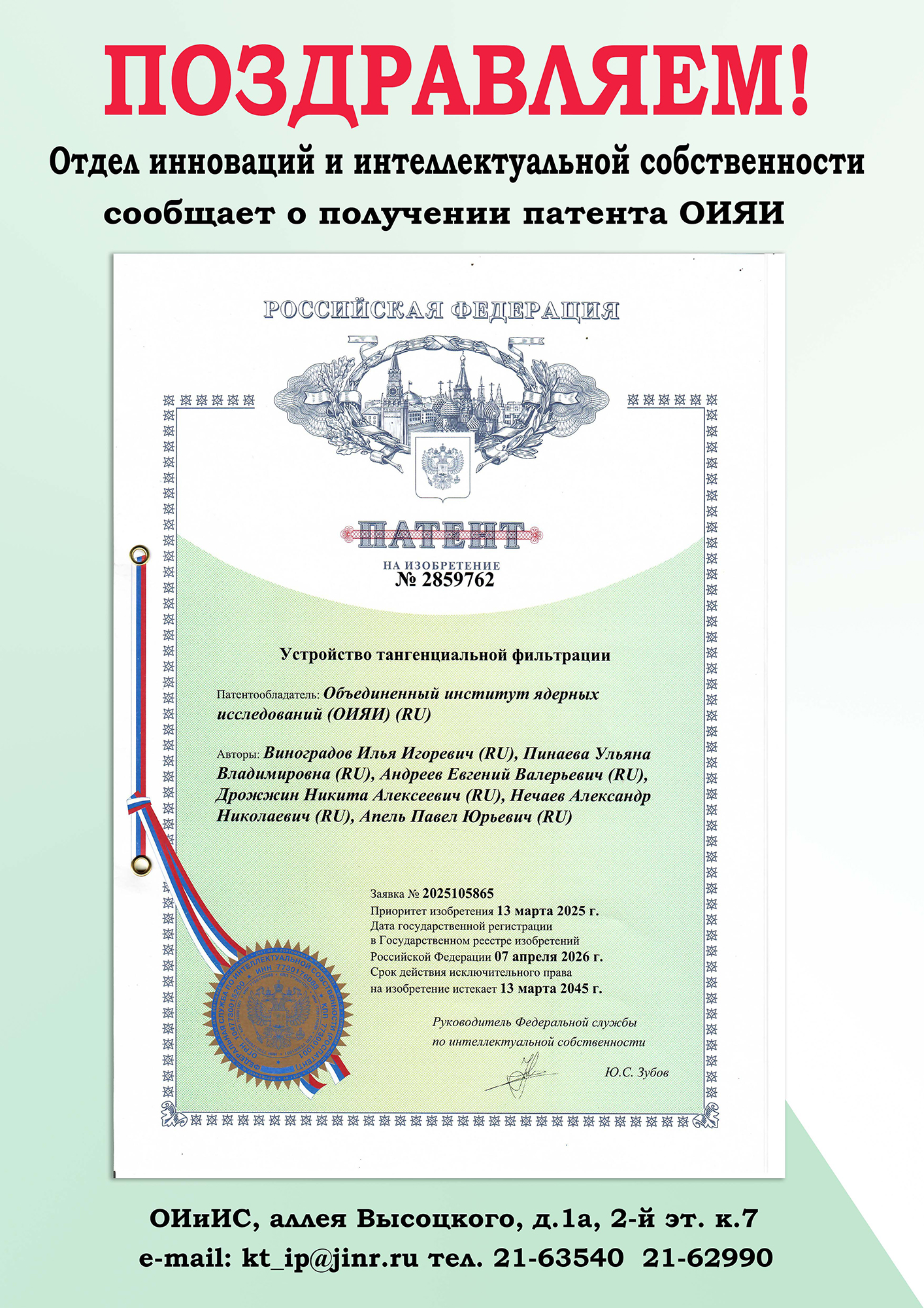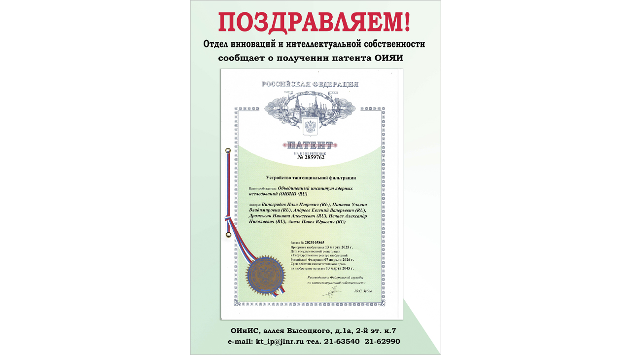 Поздравляем сотрудников Центра прикладной физики ЛЯР ОИЯИ с получением государственной регистрации!