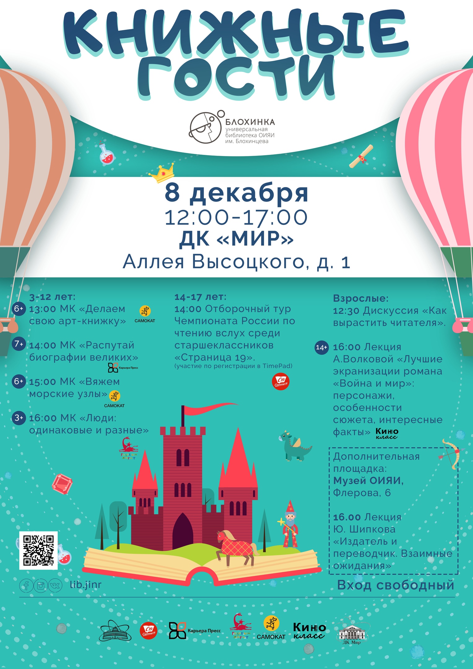 Очередной VI Фестиваль современной детской литературы «Книжные гости», проводимый Универсальной библиотекой ОИЯИ, состоится 8 декабря 2018 года с 12:00 до 18:00 часов. Фестиваль будет проходить в Малом зале Дома культуры «Мир» ОИЯИ.