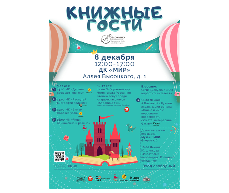 - 12:30 — Дискуссия «Как вырастить читателя». Организатор — клуб «Детское чтение глазами взрослых», приглашенные эксперты — школьный учитель литературы, библиотекарь, представители детских издательств.
