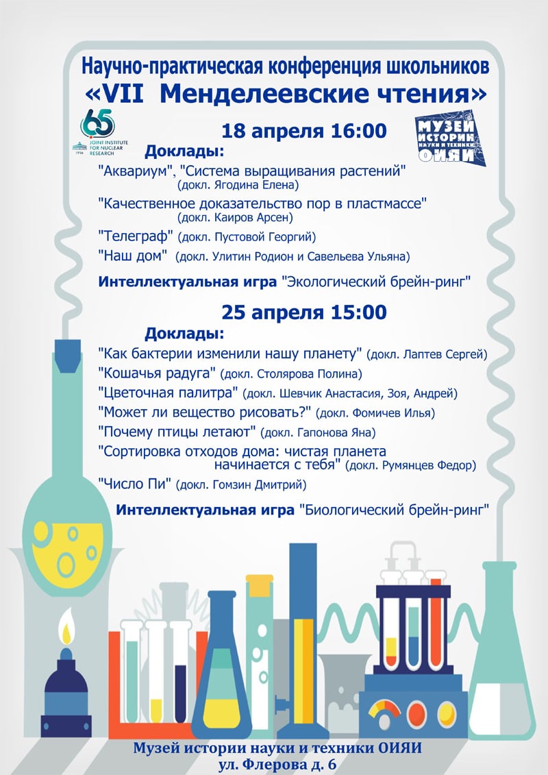 On 18 and 25 April, the Scientific and Practical Conference for schoolchildren “VII Mendeleev readings” will be held in the Museum of History of Science and Technology of JINR.