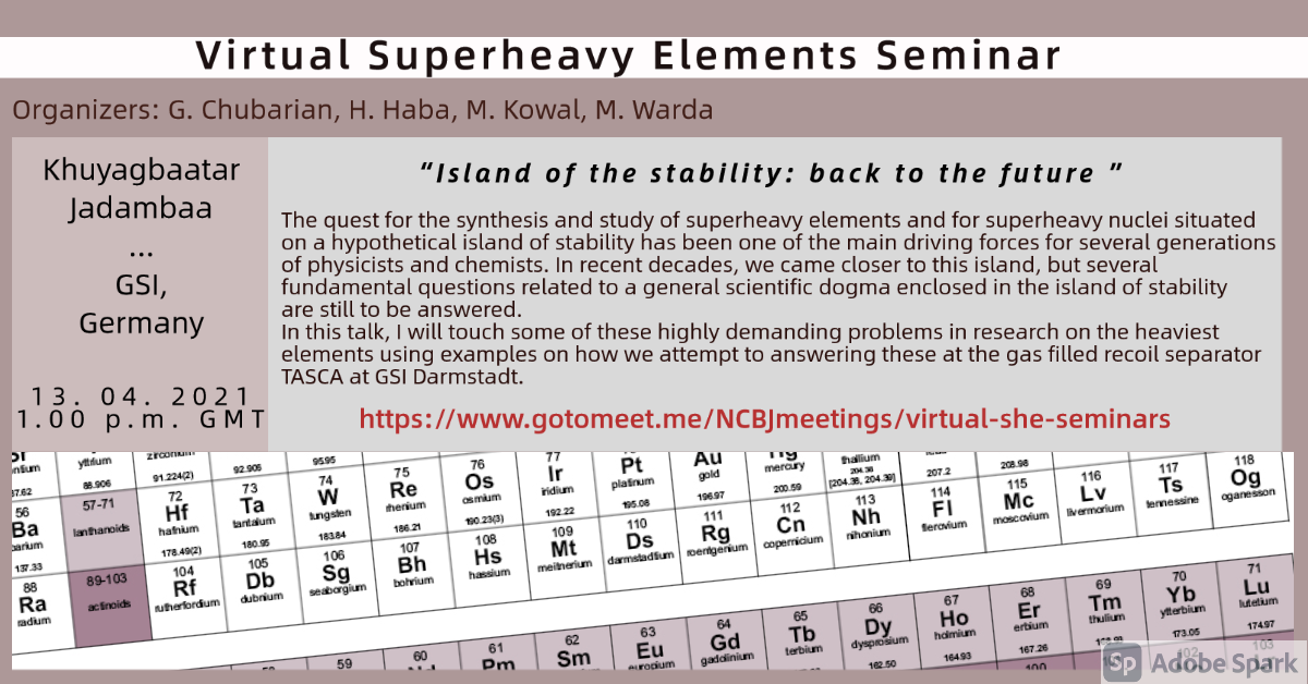 Despite the difficulties caused by the coronavirus pandemic slowing down the international collaboration and in-person contacts, the investigations of superheavy elements and publishing new results were continuing. As scientists cannot meet during any conference, the National Centre for Nuclear Research (NCBJ, Poland) has decided to create a series of virtual talks dedicated to the research on superheavy nuclei (SHE).