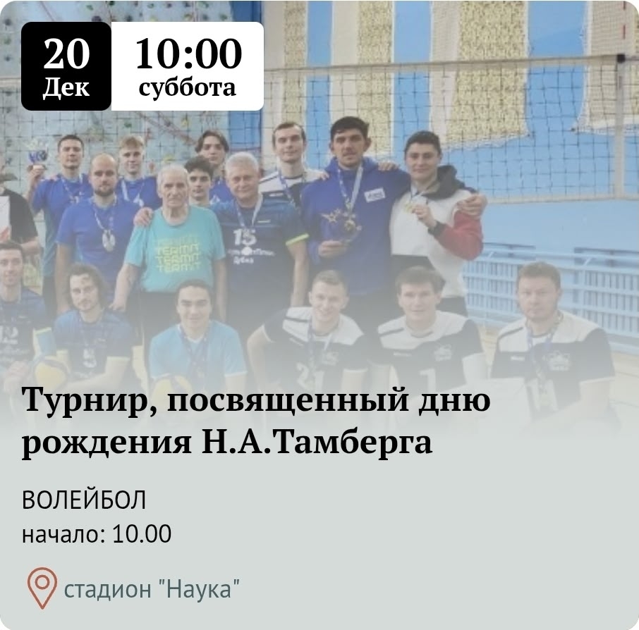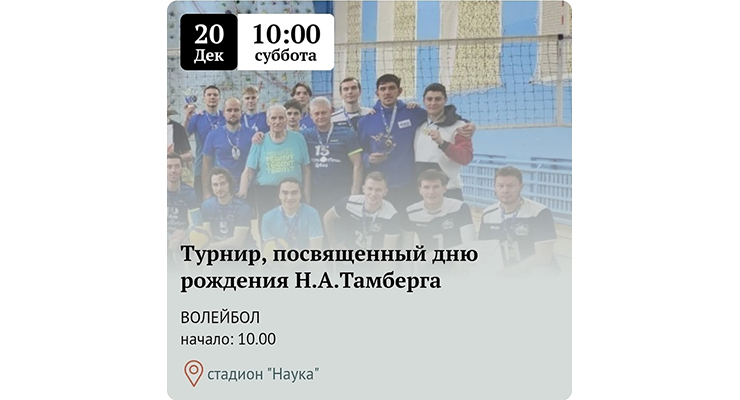 On 20 December 2025, a volleyball tournament for the prizes of Nikolay A. Tamberg will be held at the JINR Sports Complex.