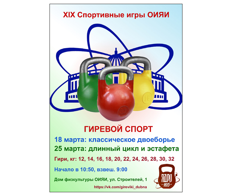 In the frames of the XIX JINR Sports Games, competitions in kettlebell lifting will be held in the JINR Sports Club (1, Stroiteley str.).
