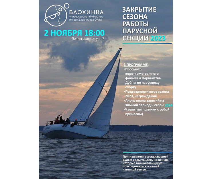 Универсальная библиотека ОИЯИ приглашает всех заинтересованных на собрание, посвященное закрытию сезона работы парусной секции.