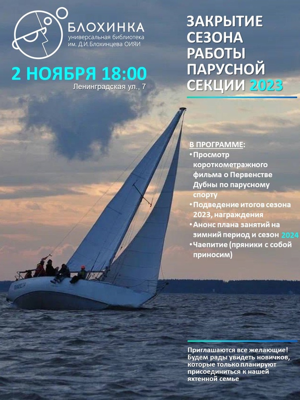 Универсальная библиотека ОИЯИ приглашает всех заинтересованных на собрание, посвященное закрытию сезона работы парусной секции.